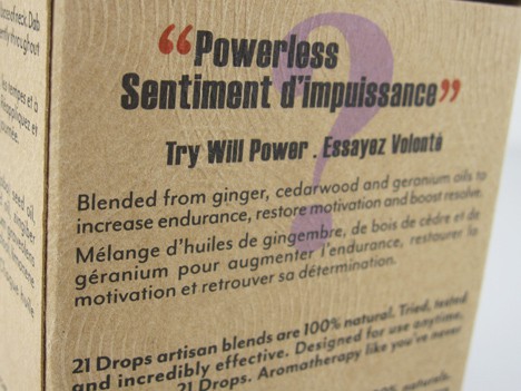 See that beautifully designed box above? It holds an alternative medicine that claims it can help me with my will power. Yeah that’s right, medicine. It’s aromatherapy and it’s been around for centuries. 21 drops is just putting a modern spin on it.