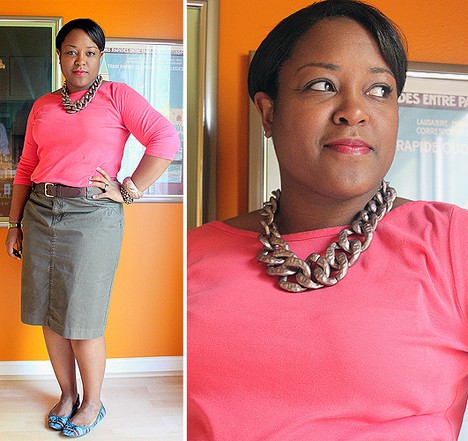 The metallic taupe shade of this necklace makes it a really versatile color to work with. Honestly, I can pair it with almost everything in my closet. For work I decided that my neutral olive green skirt would pair nicely with a bright coral boatneck. Since I wasn’t wearing any print, why not add a bit of metallic boldness with the choker? The rest of the outfit is so simple, it really let’s the necklace shine.