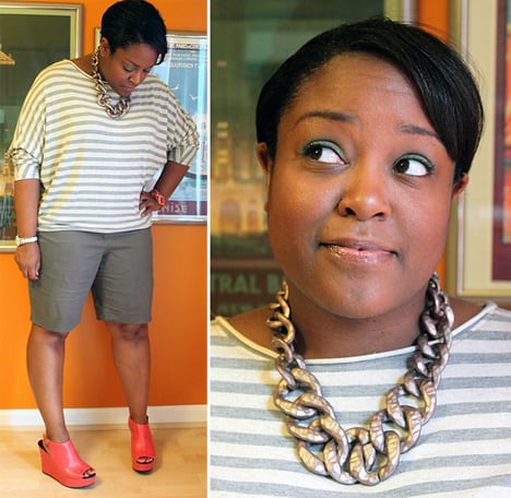 For a casual weekend day, I decided I wanted to mix the necklace with a pattern, and decided to go with stripes in the same neutral palette. Tone on tone makes it easier to mix pattern with such a bold piece of jewelry. This dolman sleeve striped top is a light top and I thought it would be fun to pair it with shorts for a casual night out with friends. Since I didn’t want to be too over the top I paired it with colorful wedges to get a pop of color in a very neutral but chic color palette.