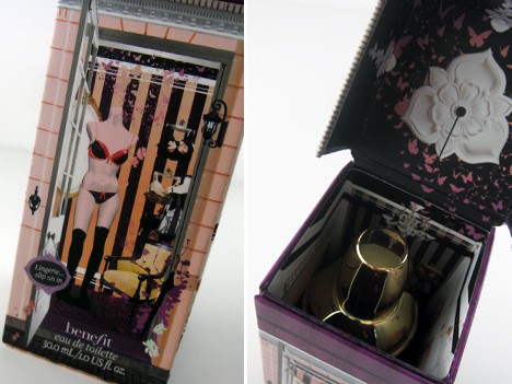The outer packaging resembles a lingerie store fitting room. When you lift the lid, the front panel of the box opens to reveal the bottle housed inside, in front of a mini lingerie store. The gold bottle is covered in a girly, multi-colored label. This bright, fun packaging perfectly suits the flirty scent inside.