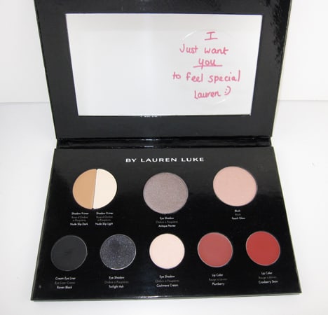 The aesthetics of this super sized palette (7.5″ x 5″) are the perfect balance of elegant and adorable. When I hold it in my hands, I feel like it’s a special gift, yet it’s not so intimidating that it makes me want to just sit and stare at it. When I open it up, I’m instantly greeted with a “handwritten note” from Lauren that’s stuck to the mirror. For some reason, this little note puts me at ease and makes me want to dive right in.