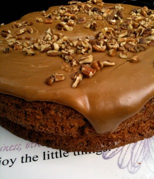 Frost the tops of both cake layers. Place one on top of the other, garnish with extra pecans if desired, and Ta Da! You have an amazing, tasty torte. Enjoy!