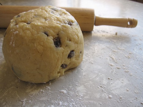2. In a large bowl, stir together flour, sugar, baking powder and salt. Using a pastry blender or two knives, cut butter into the mixture until it resembles course cornmeal. Stir in currents or your dried fruit of choice.