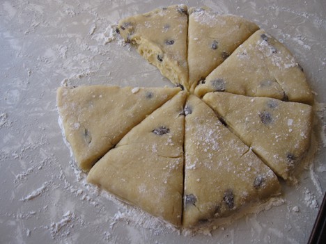 4. Gather dough into a ball and place on a lightly floured board. Roll into a half inch thick circle, and cut into triangles (as shown above).