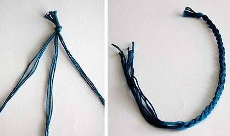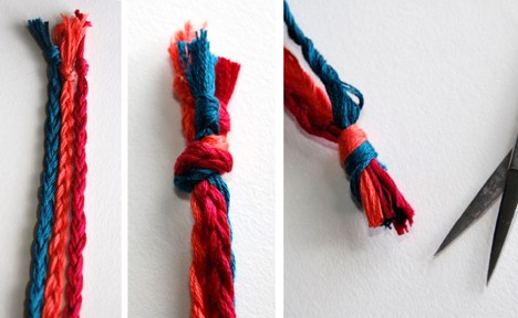 1) Measure your wrist, and multiply that by two. Cut nine strands of embroidery thread using this measurement, and tie them together.