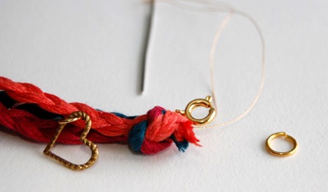 6) When you’re done adding the charms, take some needle and thread and attach the jump ring to one end of the bracelet. Repeat with the other half of the clasp.