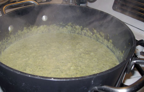 The best thing to come out of the weather (besides the fact I could wear my kick ass rain boots) was that dinner every night of the week consisted of soup, soup and more soup! Eric even pulled out the big pot and whipped up a batch of homemade, Vegetarian Cream of Broccoli Soup. I admit it isn’t the most photogenic of soups (Stef says it looks like a witches brew) but it is Green Monday after all, and look at the steam coming off the simmering pot! The magic of this soup is that it will warm you straight down to your toes.