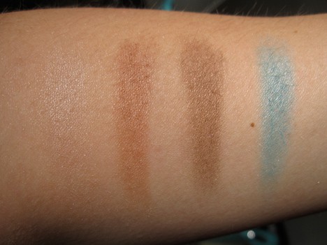 The shadows have nice (but not total) saturation. I had the palette for brown eyes. I must say that turquoise is really difficult for me to wear. I usually end up only splashing a dollop of the bright blue/green close to the inside corner of my eye. Any more than that just isn’t a good look for me. I think the green palette would, however, look amazing on me.