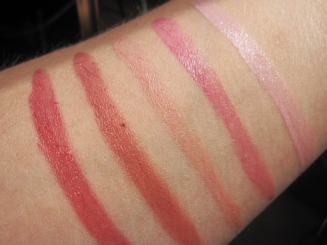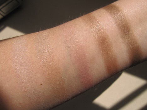 There are five pigmented shimmery shadows ranging from champagne to chocolate, five pink lip creams (think glossy lipstick) and a big ol’ mosaic blush/highlighter trio. Add mascara and you’re set.