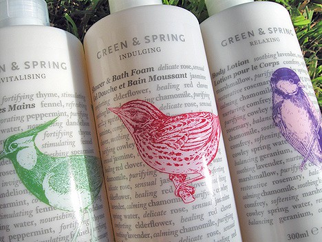 Many of the ingredients in Green & Spring products have been used by English apothecaries for centuries for their therapeutic properties. Plus, any water used as a component of a product, is sourced directly from from the natural spring located on the Cowley estate. Even better, all products are mixed by hand to ensure quality which, in my humblest opinion, gives a more personalized feel. Adding a touch of whimsy, each product package features a bird that is native to the British Isles.