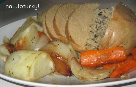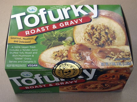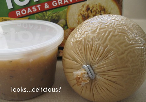 My grocery store offered the Tofurky Roast & Gravy entrée, a “pre-cooked vegetarian feast…made from a revolutionary tofu-wheat protein blend, known for its incredible, turkey-like texture and flavor.” The green-boxed Tofurky is stuffed with wild rice and whole wheat bread crumb stuffing and includes a Tofurky Giblet & Mushroom Gravy for topping the roast.