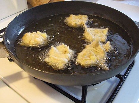 6. Carefully add dough to oil in heaping teaspoons. Cook until a light golden brown, about 2 minutes, then flip. Cook another 1-2 minutes, until both sides are browned.