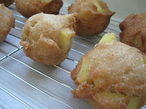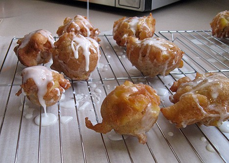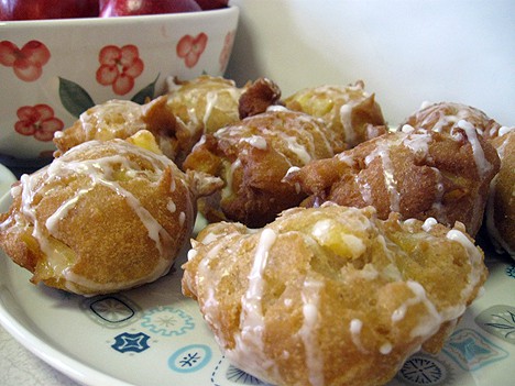 So remember that bowl of apples I mentioned – the one that sits in my kitchen all fall and contributes to almost every meal? Recently, roomie Eric discovered a new, yummy way to use my favorite fruit – homemade apple fritters.