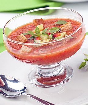 1. Combine cucumber, green pepper, pimento, onion, parsley, basil and garlic