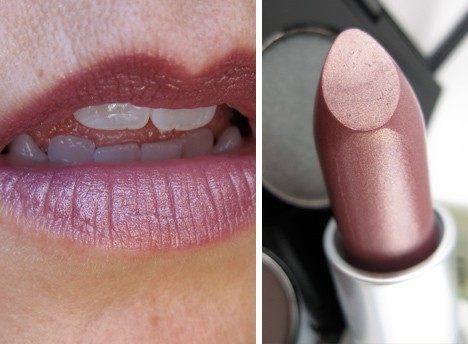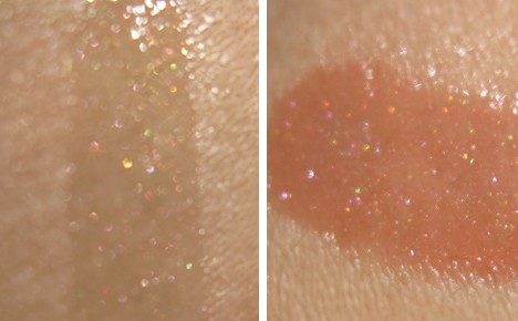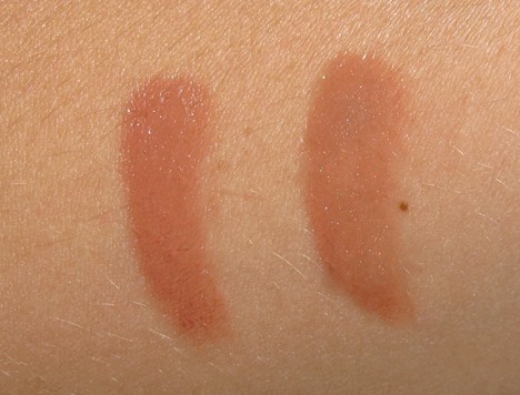Jealous alone left, blurred to show shimmer, and over a Nude lipstick on right.