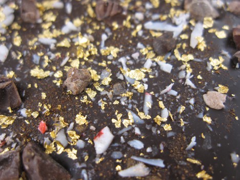 Krista’s Indulgence – dark chocolate bar with crushed peppermints, cinnamon, cocoa nibs and gold flakes