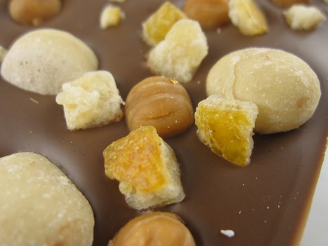 Tyna’s Indulgence – milk chocolate bar with macadamia nuts, caramel pieces and orange peel