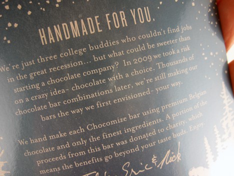No matter what your flavor preferences, Chocomize has something for you. Whether you are customizing a chocolate bar for yourself, a gift for someone else, or looking for a unique party favor; you are bound to create something not only tasty, but also visually impressive. These are not your typical candy bars, people!