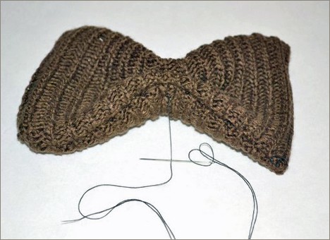 9. Pinch together the middle of your ‘soon to be bow’ and carefully stitch back and forth with a needle to form your bow.