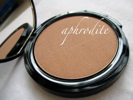 I’m sure many of you have also discovered that finding the right color ratio for a bronzer can be a seriously difficult task. I’ve used a lot of bronzers, and they either tend to be too dark, too light, or have way too much shimmer. Through the use of light reflecting minerals, Aphrodite has captured a beautiful blend of color; a medium tone bronze, with a pretty gold shimmer, but finely ground so it gives a nice glow without looking too glittery.