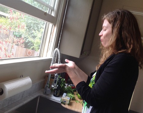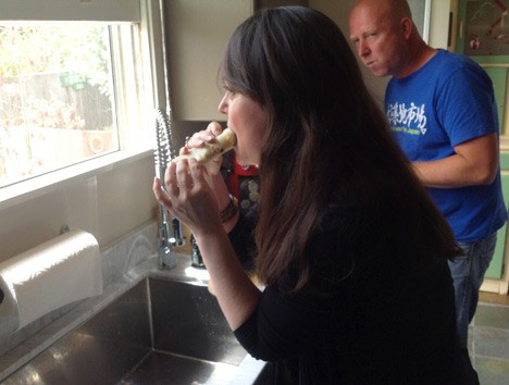 The crunch of the potato crust contrasted perfectly with the cool sauce and creamy avocado. Breaking bread with a Top Chef over his own sink – priceless!