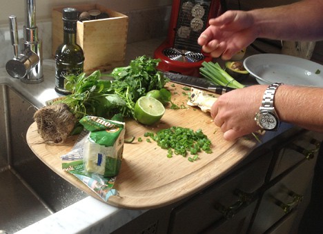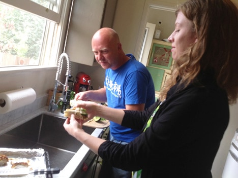 While the fish was cooking, he thinly sliced jalapeno and some pepper jack cheese, cut up an avocado, and prepared a deliciously easy sauce of mayo (Best Foods/Hellman’s all the way, no subs according to both Stefan and Tyna!), chipotle Tabasco sauce, lime and fresh cilantro.