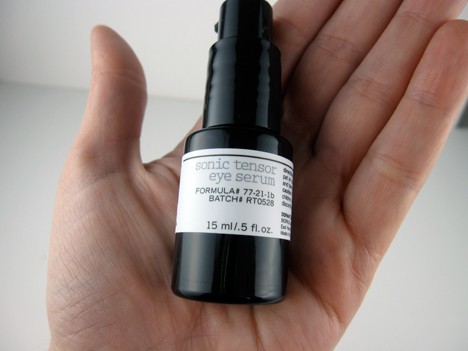 Sonic Tensor is to be sparingly patted on with the ring finger (to use the slightest pressure possible on this thinnest skin of the body), under the eye and all the way around in a circle up to the brow bone. Sparingly means don’t depress the pump all the way – I find I only need maybe a quarter of a pump – even half a pump gives too much product.