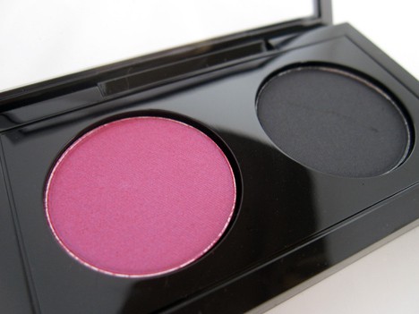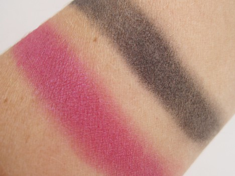 Double Feature 7 is a bright fuchsia frost with a purple sheen and a soft charcoal grey with a satin finish. Again, there was sheen in the pan, but it doesn’t show when applied. And like the satin in #3, it’s chalky too. Boo.