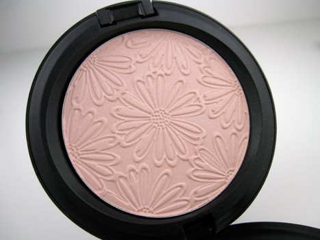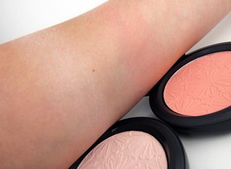 I am helpless when it comes to Beauty Powders; part highlighter, part blush. They’re finely milled and always limited edition, a combo sure to make me weak in the knees. And the flower imprint makes them all the more desirable. The two Beauty Powders in the launch are very different from each other. Light Sunshine leans more towards a highlighter, a nearly white it’s so pale-pink, with gold and pink micro shimmer. While Alpha Girl, a bright coral pink, leans more towards a blush. MAC says there are gold nuances in this, I don’t see them and wish I did. This looks rather matte on me. I think some gold sheen would be really beautiful in this shade. Both shades are very subtle (as you can see form my nearly unnoticeable swatches. There’s more color in person, and on the cheeks.