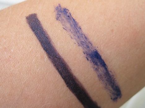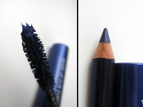 While they work beautifully together when color matched, I bucked the system and chose Smoky Lash in dark blue/#5 and the Kohl Pencil in pearly black purple/#10K. Which worked out well, they’re really quite similar as you can see in the swatch photo. The dark blue mascara leans heavy to the purple side (and I love it for that).