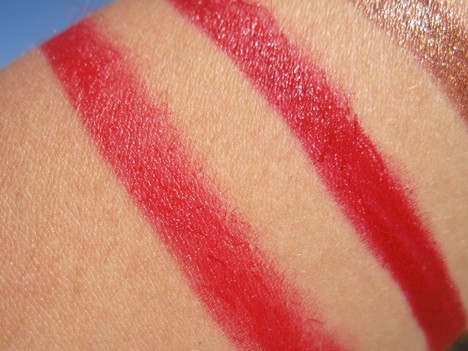 I got to test out Red Velvet and Red Label. The colors are a deep red with a hint of pink (on me, anyways) and a bright red with a hint of pink (again, on me–your body chemistry may react differently), respectively. Both gave a pop of drama–the colors are lovely. The staying power is fairly decent, too, though this is the ONLY lipstick I’ve ever had “feather” on me. I’ve never had a lipstick do that before and I didn’t know what was up with that–this seriously traveled on me. Also, I’ve had a series of allergic reactions to a few Milani products now and this one made my lips burn and then when I took this off, my lips were very dry–like the moisture was sucked out of them dry. Then there was the smell–artificial grape and some perfume-y chemical smell–like grapes and detergent. It made me nauseous. I’m giving this 3 stars for great colors and wearing power and for price, deducting 2 stars for feathering and the smell. Sadly, this was not a “win” for me :(