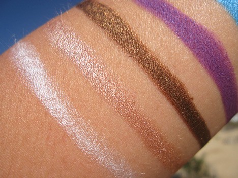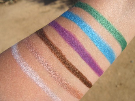 I also tested Brown Deluxe and Royal Purple – and they are spot on perfect colors for my light brown/amber eyes. The brown is a perfect every day thick liner/all over lid color with extra oomph glisten – really, really pretty. I am wearing it often this summer. I’ve only worn the purple a couple times because it’s pretty intense – you’ve really got to want those eyes to be noticed, and not mind the thick liner. I’d usually go with a much thinner line for that intense of a color. My three year-old kept talking about my bright purple eyes all day when I wore it and it was only on as a liner. But it’s a gorgeous color. I also have fairly oily lids and these last on me all day – they are tough to get off. On my lazy nights when I’ve not used my oil-based remover at night…they are still there in the morning. Great color saturation, beautiful shimmer, and long-lasting for the price. 5 stars from me.