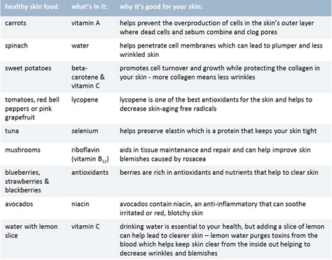 This month our friends at Eucerin want to remind you that it’s not just what you put on your skin, but also what you put in your body, that leads to happy, healthy skin. The old saying “you are what you eat” is true. Eating a diet rich in fresh fruits and vegetables and drinking plenty of water (instead of sugary sodas and drinks) helps your body and its organs run a their peak performance. And since your skin is the largest organ of your body, it makes sense that eating nutritious, vitamin and antioxidant packed foods will reflect in a glowing complexion and smooth skin.