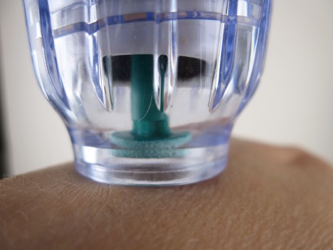 After watching the instructional DVD, I washed and thoroughly dried my face and got down to business. The device works by vacuuming your skin up to the surface of the disc as it spins. Creating a seal that they say increases blood flow, but also insures better contact between your skin and the disc.
