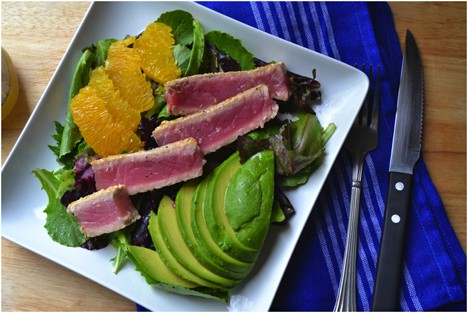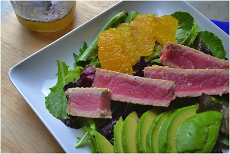 seared ahi tuna salad recipe served with avocado and ornages