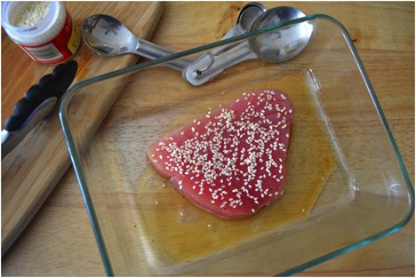 2. Add the sesame or olive oil to a plate or Pyrex dish. Coat both sides of the tuna steak in the oil. Sprinkle the top side of the oil coated tuna with ½ teaspoon of sesame seeds.