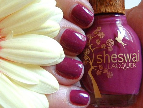 Sheswai Lacquer just might win my award for cutest nail polish bottle ever. Do you see the adorable graphics? And that beautiful wooden handle is a great example of their eco-chic style and is made from “sustainably harvested wood, grown on family owned tree farms”.