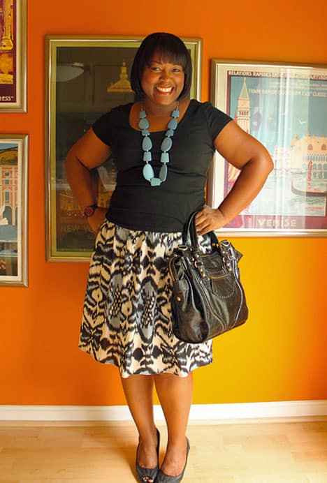 To dress the bag up, I added it to a work outfit. When dressing for my job, I typically have a uniform of a full skirt or pencil skirt, scoop neck top, a peep toe or wedge heel and then great accessories. The structured shape and classic black make this an easy option for a polished work bag. It’s so classic that it will go with anything in your closet and I like that.