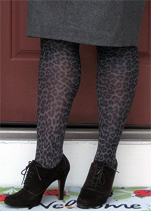 Not ready just yet for leopard? Try a great plaid, metallic or even a lace tight to add a graphic pattern to basic colors. Play with the colors in the tights and match them to your outfit (the leopard print tights are grey, green and brown just like my outfit).
