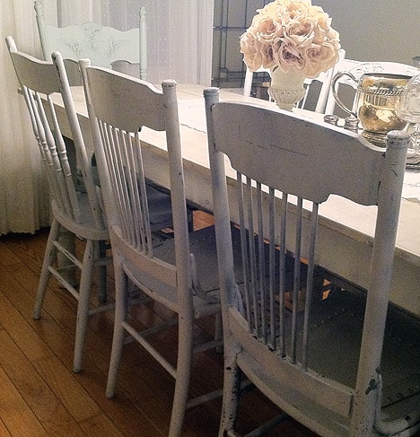 6. Combine different pieces to create a formal but still very usable dining set. This farm table (above) is made with vintage pine floorboards. I found a number of mismatched antique chairs, purchased in pairs, to surround this great piece. Bonus: switching around the hodge-podge of chairs mean I never get bored with the look of the room!
