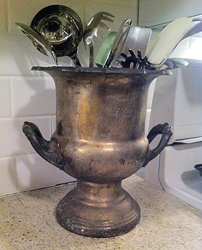 1. Find an antique “urn style” ice bucket to hold kitchen utensils. I bought some inexpensive stainless utensils to put inside my antiqued piece (above image) and now, instead of looking like clutter, it looks like it belongs on my counter. I also prefer the grungier looking ones instead of the shined up ones!