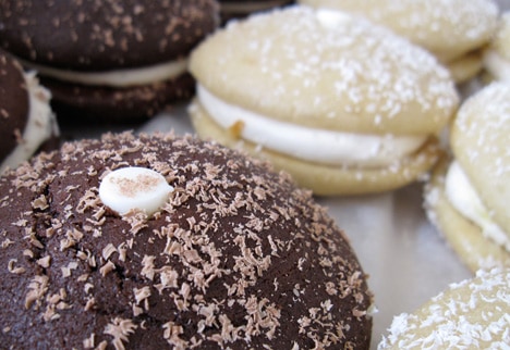When we were planning a menu for our Grease Musical Sunday party, we became stumped on the appropriate dessert. We wanted something sweet, maybe apple pie? No, we wanted chocolate for sure. Maybe ice cream? Too messy. How about cupcakes? So over done. Our answer appeared not as Frankie Avalon, but in the angelic form of Roxy Rubel, founder of the Los Angeles area company, Baking Whoopie, bearing a box of the latest tinseltown treats, the Whoopie Pie.