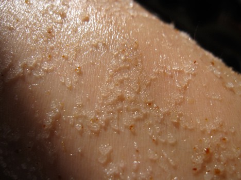 Definitely five stars from me! This scrub smells sooo sweet that I did have to taste (well, fresh and sugary and all natural can’t hurt, right?). Yeah, don’t do that. It tastes a little salty and decidedly unlike what it smells of. Can’t blame a girl for trying something that seems like it would taste great on some oatmeal.