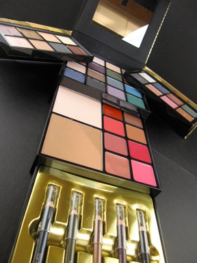 The biggest piece in the collection is The Jewelry Box ($52, a Sephora exclusive). And since it is the season to give, we’re giving we heart this readers the chance to win it (enter the giveaway HERE!) This is one impressive palette. Four layers of product (yes, you read that right – four!) including 47 products and a totally adorable mutli-chain gold necklace. Above is a glimpse of the 2 layers of eye shadows, and all 4 layers in their extended glory. Here’s a closer look…