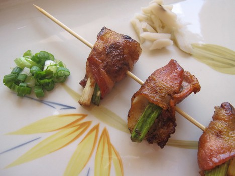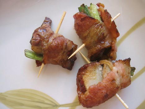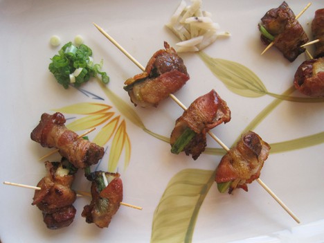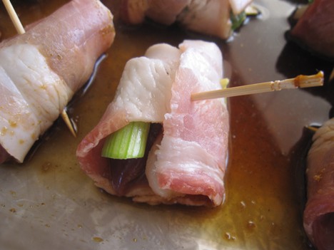 2. Wrap a strip of bacon and a scallion piece around the liver/chestnut core, pinning each kabob with 2 toothpicks.