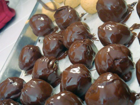 8. Place each chocolate covered ball on a paper-lined cookie sheet, remove pick. Continue procedure until all balls are coated.