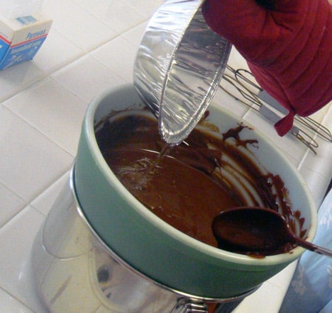 6. Stir with a spatula, scraping down the sides of the bowl, then heat 30 seconds more. Continue heating and stirring for 15-second intervals until the chocolate is uniformly smooth and glossy.
