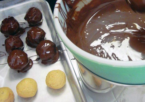 7. Remove the chilled peanut butter balls from refrigerator and dip each one into the melted chocolate. I use a toothpick stuck through the ball to carefully dip into the chocolate. You can also use a wire egg dipper.
